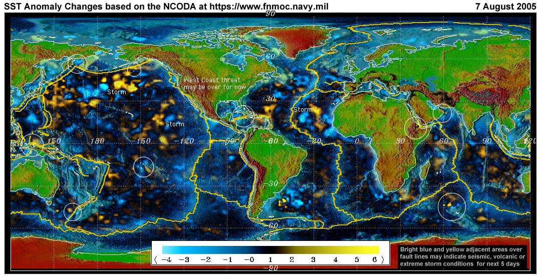 DEYO NOTES: For earthquake maps, see the USGS "shake maps" (click anywhere on the global map for a closer view). For quakes USGS may not list, go to the European-Mediterranean Seismological Center's map and scroll to the bottom of the page for a global view. You can compare these maps for the next 5 days to Stan's NCODA maps, to see the hits of his seismic target zones (white circles).