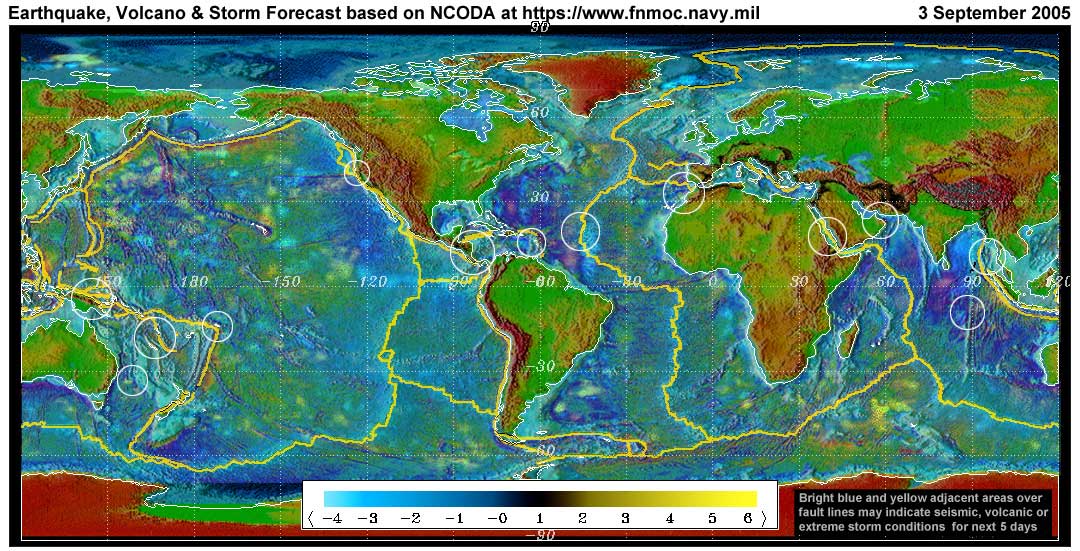 Stan's analysis shows areas of possible earthquake or volcanic activity, or extreme storm conditions for the next 1 to 5 days. Pay particular attention to areas marked by white circles. The continuous yellow line denotes plate tectonic boundaries as well as the Ring of Fire. Go to the raw data map where it is easier to see the areas of concern. Go to Stan's earthquake map archives.