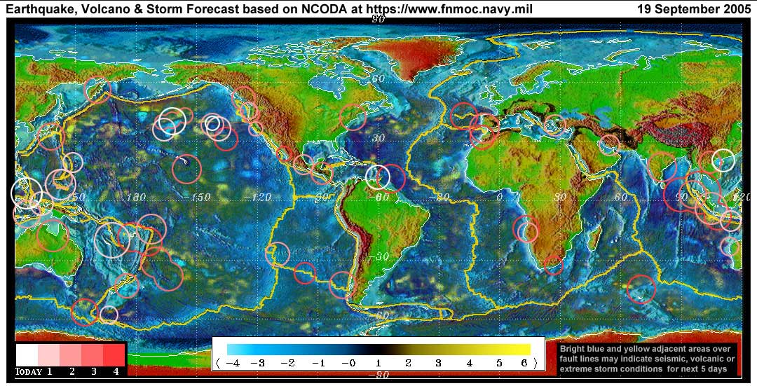 Stan's analysis shows areas of possible earthquake or volcanic activity, or extreme storm conditions for the next 1 to 5 days. Pay particular attention to areas marked by white circles. The continuous yellow line denotes plate tectonic boundaries as well as the Ring of Fire. Go to the raw data map where it is easier to see the areas of concern. Go to Stan's earthquake map archives.